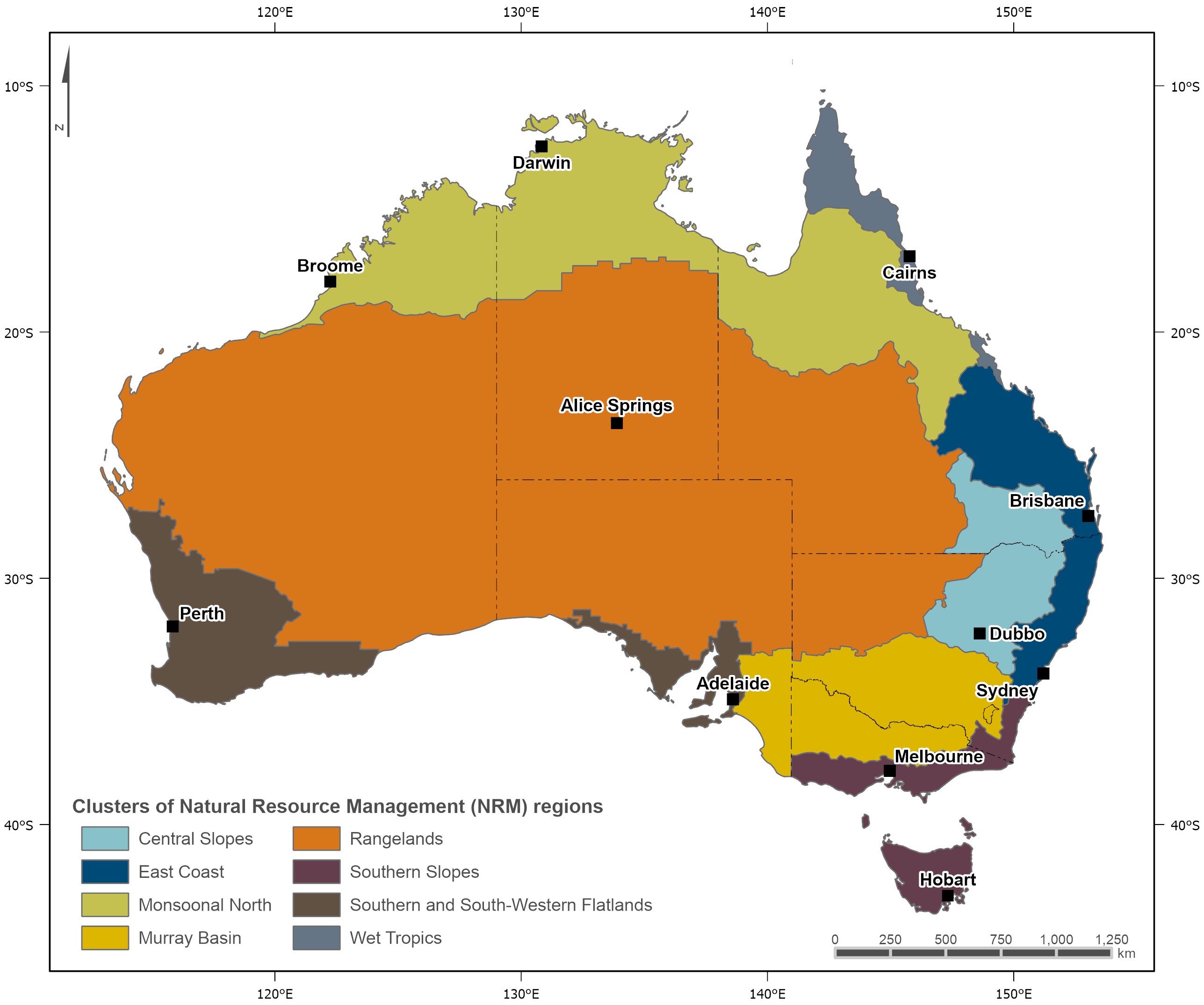 Description: <DIV STYLE="text-align:Left;"><DIV><DIV><P><SPAN>Eight</SPAN><SPAN> </SPAN><SPAN>Australian Water Outlook (AWO) </SPAN><SPAN>National Hydrological Projection </SPAN><SPAN>assessment </SPAN><SPAN>cluster areas of natural resource management (NRM) regions of Australia</SPAN><SPAN>, </SPAN><SPAN>compiled to support the Australian Water Outlook's National Hydrological Projections assessment reports</SPAN><SPAN /></P><P><SPAN>https://awo.bom.gov.au/about/overview/assessment-reports</SPAN><SPAN /><SPAN /></P><P><SPAN>These regions align with regions used in the Climate Change in Australia initiative, a comprehensive national climate change study produced jointly by the Bureau, CSIRO and other partners.</SPAN><SPAN /></P><P><SPAN>Eight</SPAN><SPAN> </SPAN><SPAN>c</SPAN><SPAN>luster areas derived from merging 63 natural resource management areas based on </SPAN><SPAN>distinct geographic and climate conditions that are affected differently by climate change</SPAN><SPAN>.</SPAN><SPAN /></P><P><SPAN /></P></DIV></DIV></DIV>